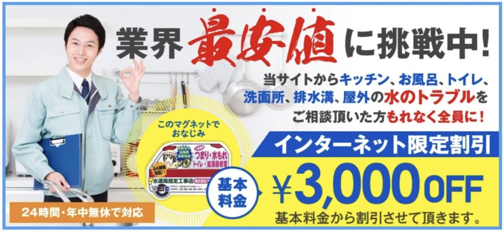 | キャンペーン | ネット割引キャンペーン:基本料金3,000円→0円。お問い合わせ時に「ホームページを見た」と伝える |