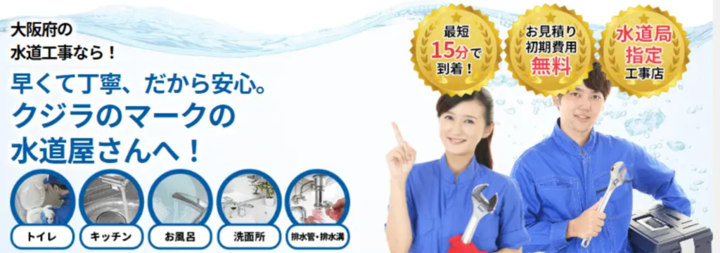 クジラのマークの水道屋さんは、大阪府全域で24時間365日対応・最短15分で駆けつけます。無料見積もり・作業前キャンセル無料で、料金にご納得いただいてから作業を開始しますので、費用面が心配な方も安心です。HP経由のご依頼なら2,000円割引で対応いたします。